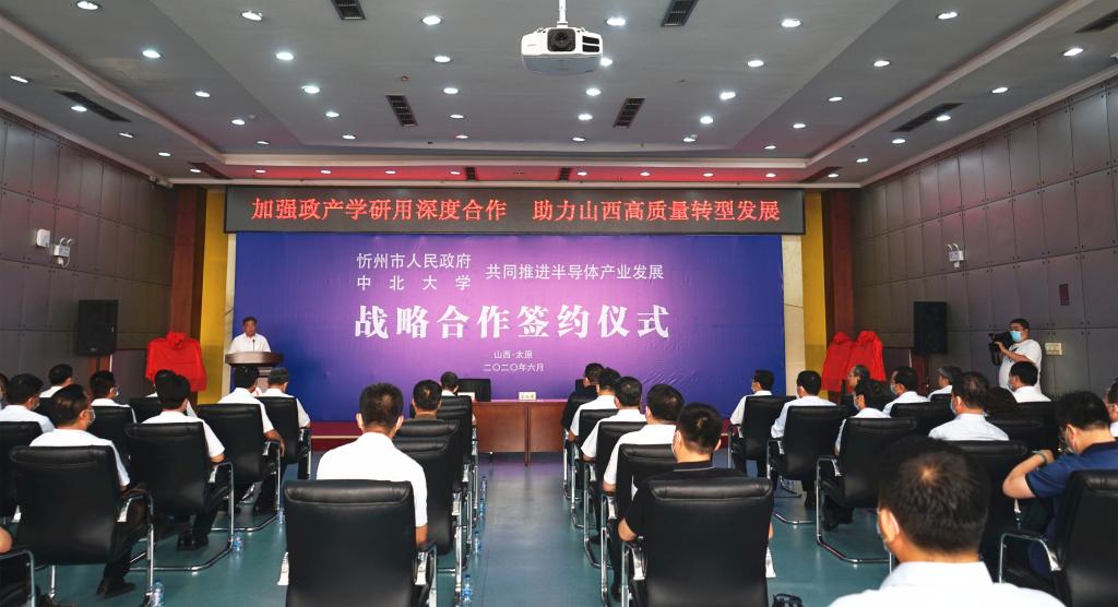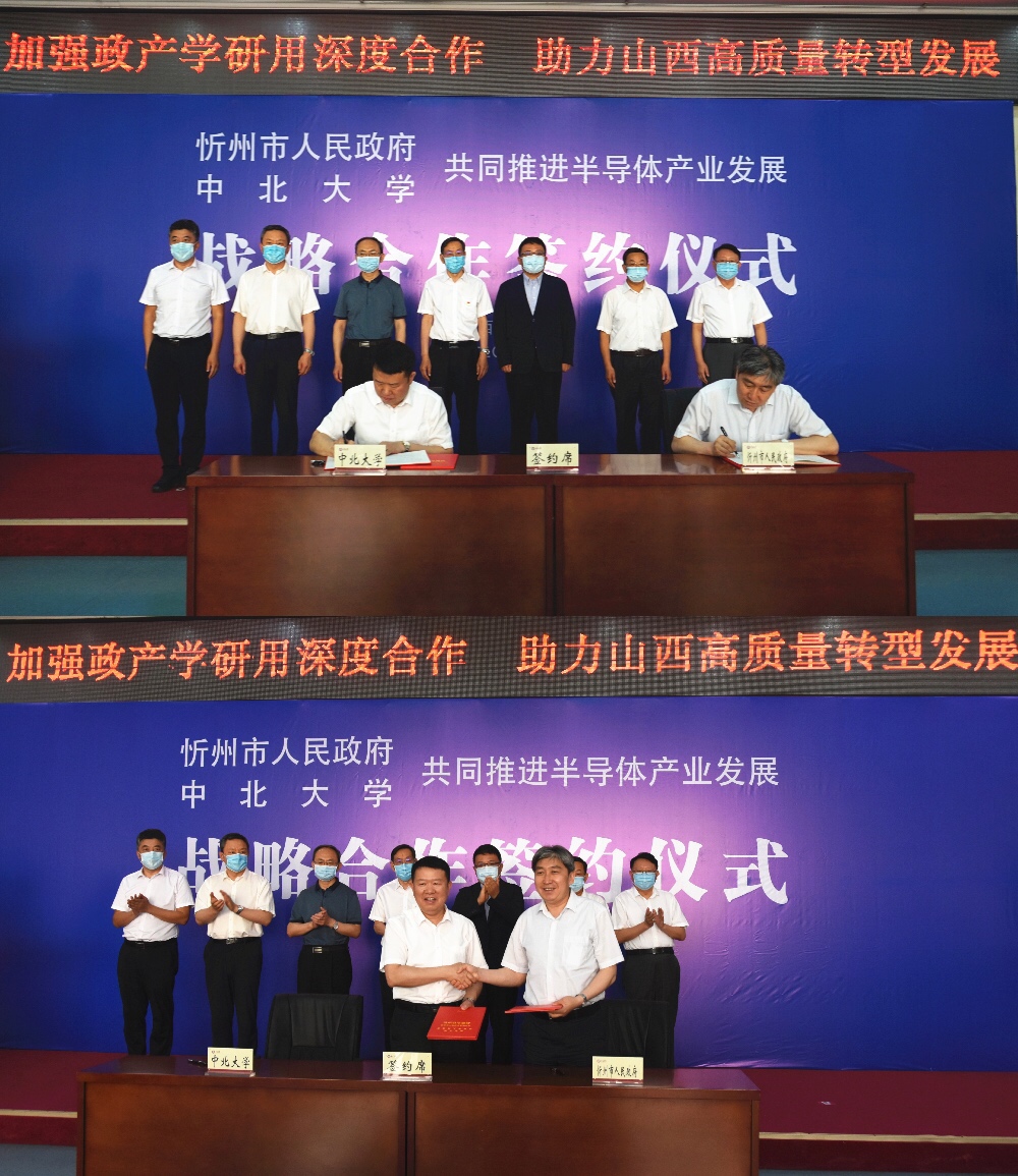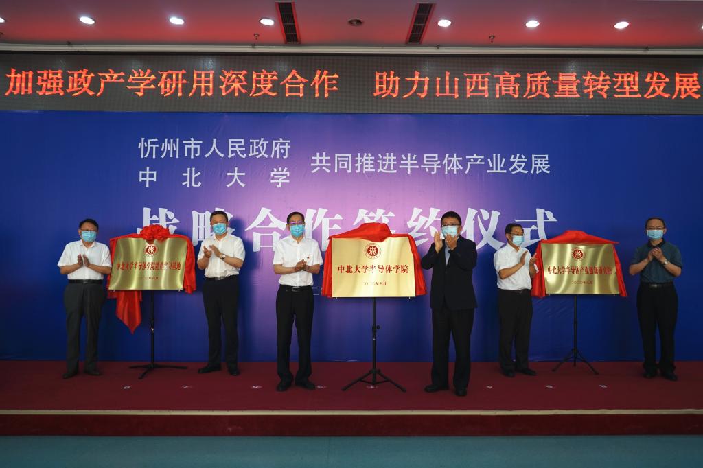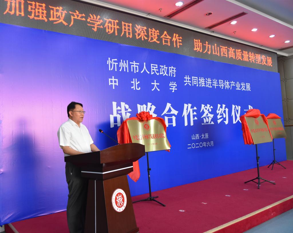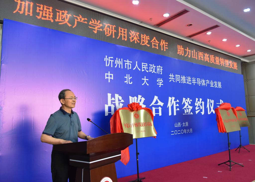 6月18日上午,我校与忻州市人民政府战略合作协议签约仪式在主楼十五层会议室举行。副省长吴伟来校出席签约仪式并与中国工程院院士李魁武共同为“中北大学半导体学院”揭牌;省政府副秘书长张文栋和忻州市委书记郑连生共同为“中北大学半导体产业创新研究院”揭牌;省教育厅厅长吴俊清和我校党委书记李忠人共同为“中北大学半导体学院就业实习基地”揭牌;我校校长沈兴全和忻州市委副书记、市长朱晓东代表双方签署《中北大学——忻州市人民政府共同推进半导体产业发展战略合作协议》。
