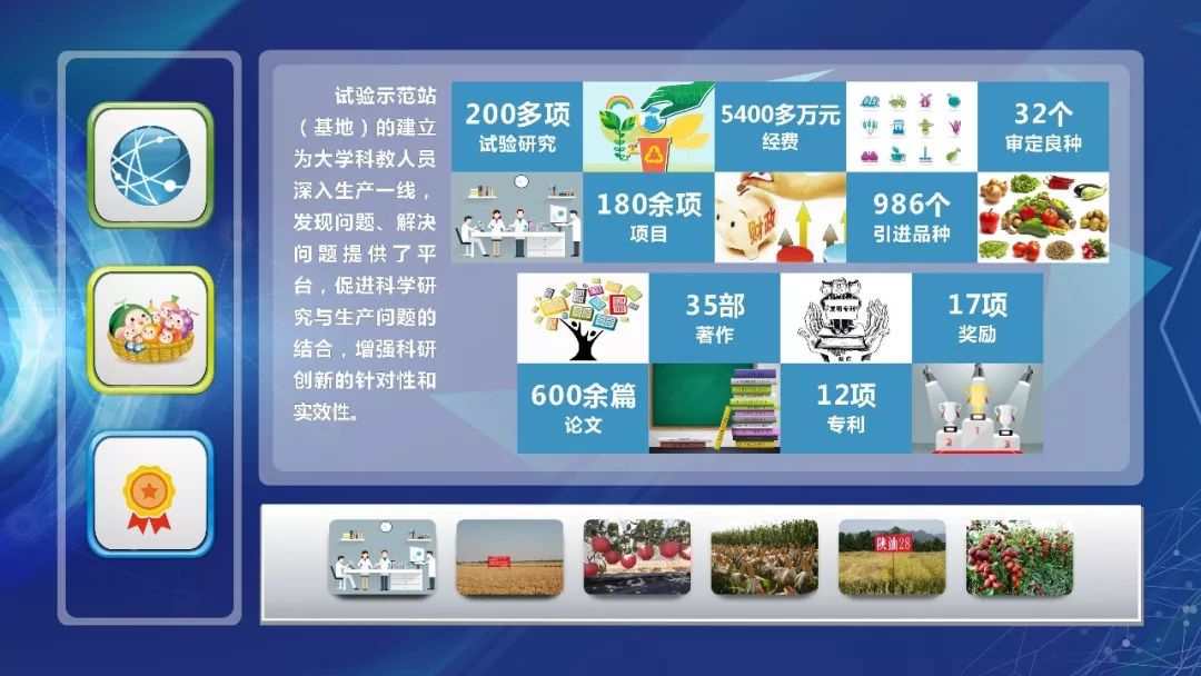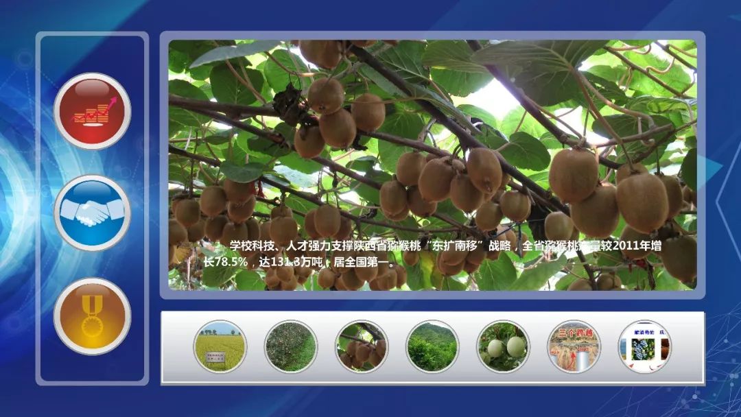通过“大学+科技园+试验站+地方政府科技部门+示范户+千家万户”农业科技传播途径和技术推广转化辐射模式,在国内15个省(区)以及哈萨克斯坦、吉尔吉斯斯坦等国家建立了27个试验示范站和46个农业科技示范基地,形成了立足陕西、面向西北、辐射全国及中亚的试验示范站体系。先后实施各类推广项目300余项,转化各类技术200余项,推广应用新品种50余个,新增经济效益500多亿元。得到当地政府和上级领导的肯定,引领了区域主导产业的发展。眉县猕猴桃通过技术示范的引领与带动,规模从8.3万亩发展到现在的30万亩,总产值4亿元增加到29亿元。西农979小麦新品种,通过建立示范园的孵化与推广,使该品种在黄淮麦区年均种植面积从不足300万亩,增加到1100万亩,成为黄淮麦区四大主栽品种之一。