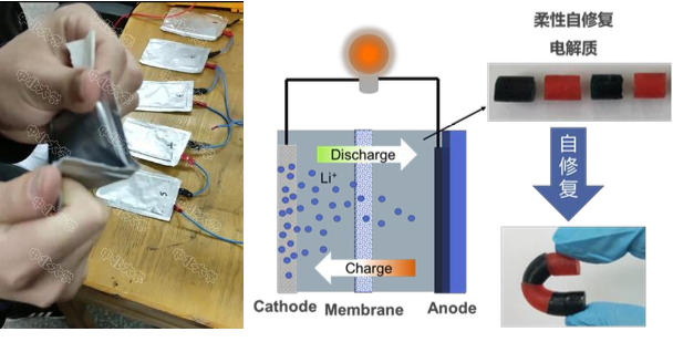 成果简介:本成果将自修复新型高分子固态电解质引入传统锂离子电池,通过对电极材料和 离子传输方式进行重新设计,将柔性自修复电解质和柔性电极材料进行整合与优化,成功制 备高柔性高安全性固态锂离子储能电池,与传统商业化锂离子电池相比,具有相当的比容量 密度和更高的充放电循环寿命。同时,具有传统商业化锂离子电池所不具备的高柔韧性和高 安全性能。